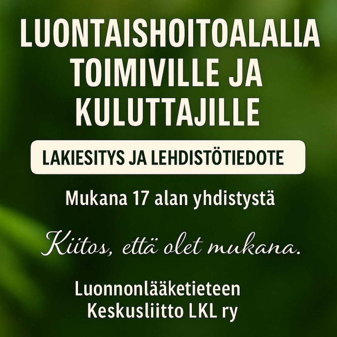 Peräti 17 luontaishoitoalalla toimivaa yhdistystä allekirjoitti yhteistyöllä laaditun lakialoitteen STM:n lainsäätelytyön avuksi. Tutustu lakialoitteeseemme, ja siitä tehtyyn lehdistötiedotteeseen! LKL ry:n somekanavissa löytyy runsaasti ajankohtaista tietoa aiheesta.